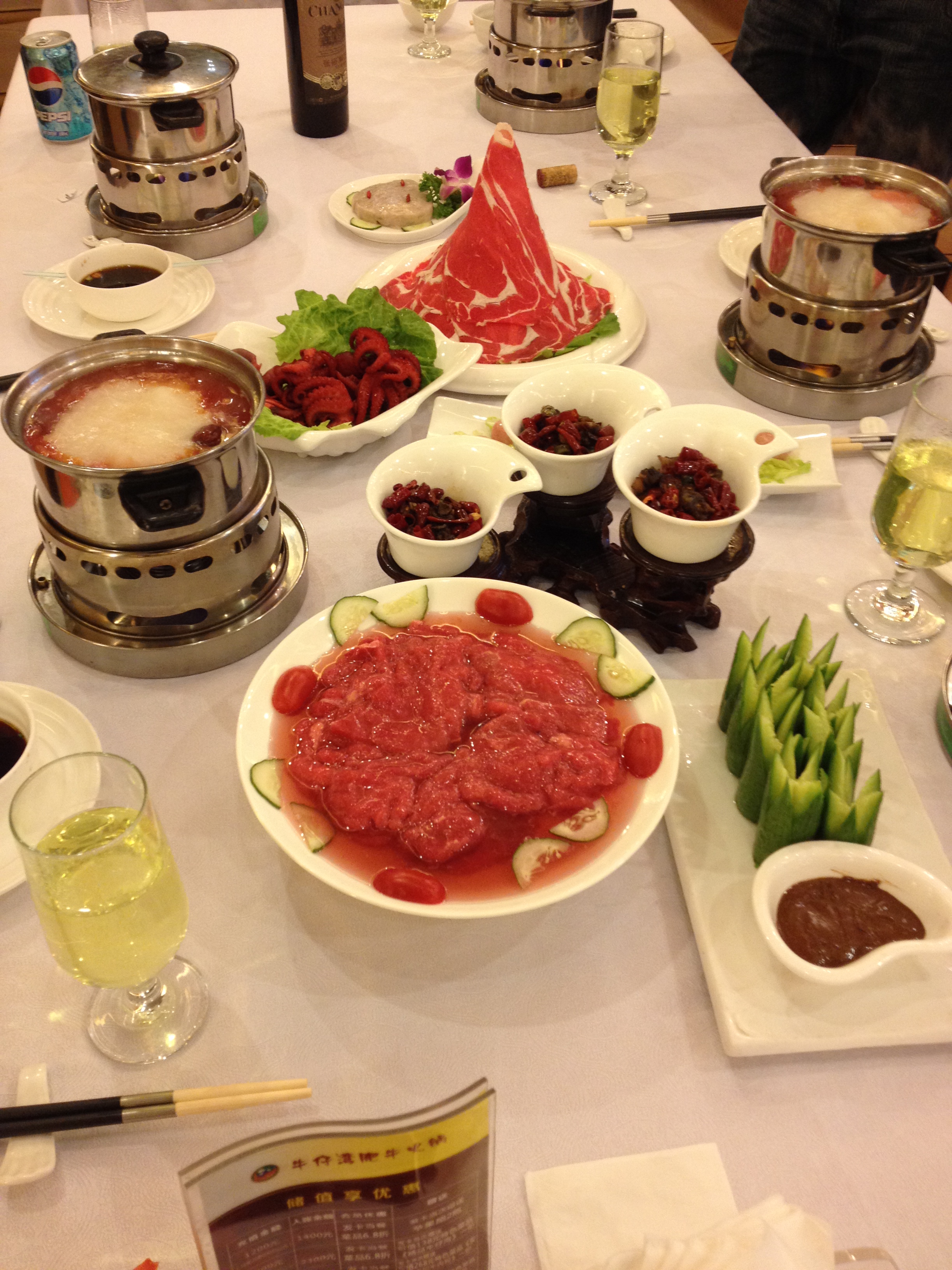 I eat spicy in honor of my friends who are not with me and who love spicy food. I could do without it, but I can’t thumb my nose at the jealousy which accompanied me here over spicy food. So yesterday I went for hot pot with Bill, Vega, and the visiting investor Mr. Wu and his wife. Hot pot, at least in the street restaurants, is served communally. In the center of the table is a big, boiling vat of oil and broth, and families just dunk and cook meat and vegetables all together. We went to a “fancy” hot pot restaurant, where each person got their own little cooker. Mrs. Wu was kind enough to stop me before I drank my “soup” which was actually soy sauce and peppers. Mr. Wu ordered food for the table, and asked me to approve the wine.