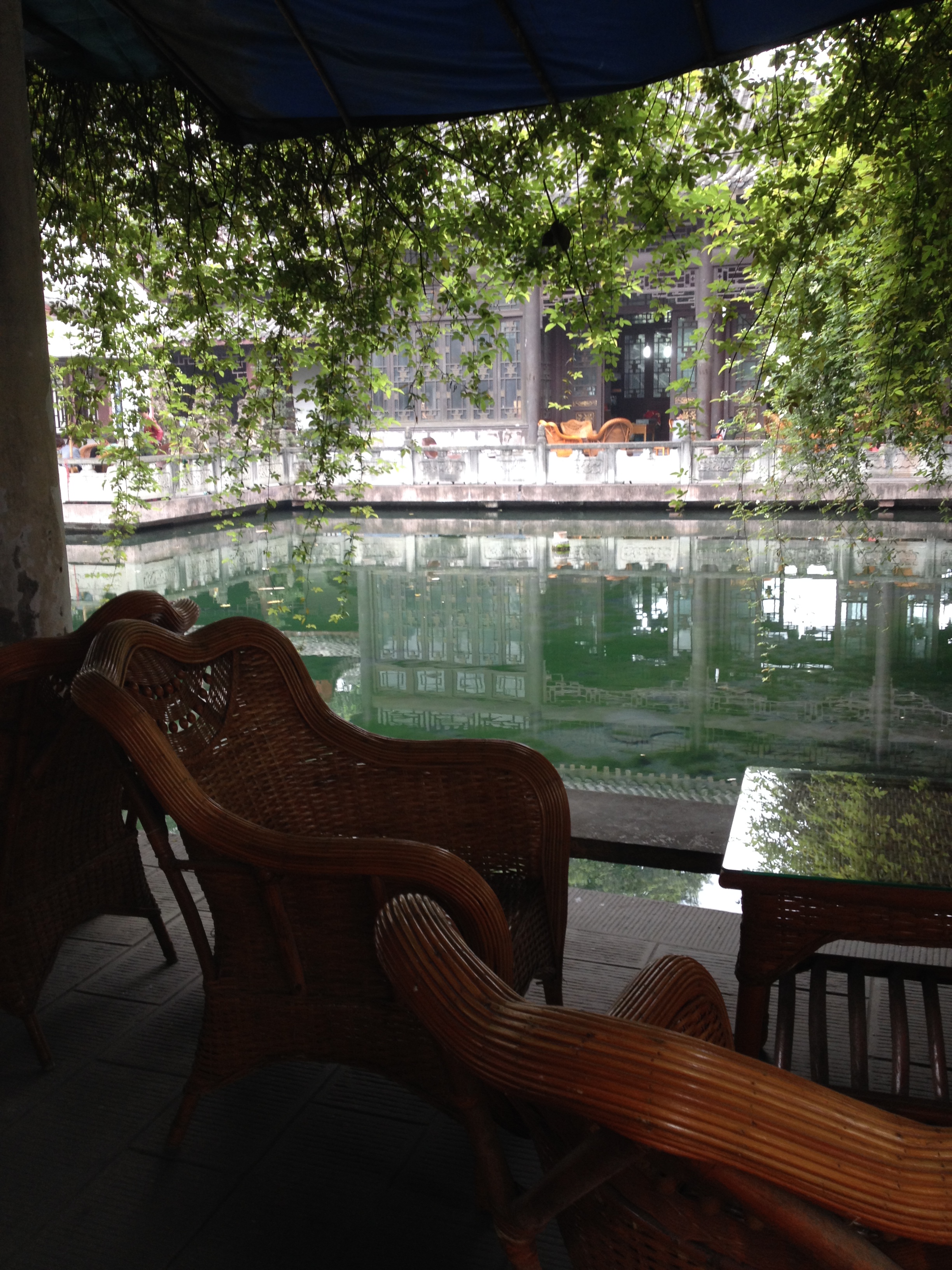 It’s possible I’ll be overcharged – 4kuai. It’s hard to wrap my head around that I’m getting ripped off being charged seventy-five cents instead of a quarter. More so because the tea will be refilled regularly without further charge. I can spend the day here for a dollar, listening to birds, watching golden fish, drinking tea.